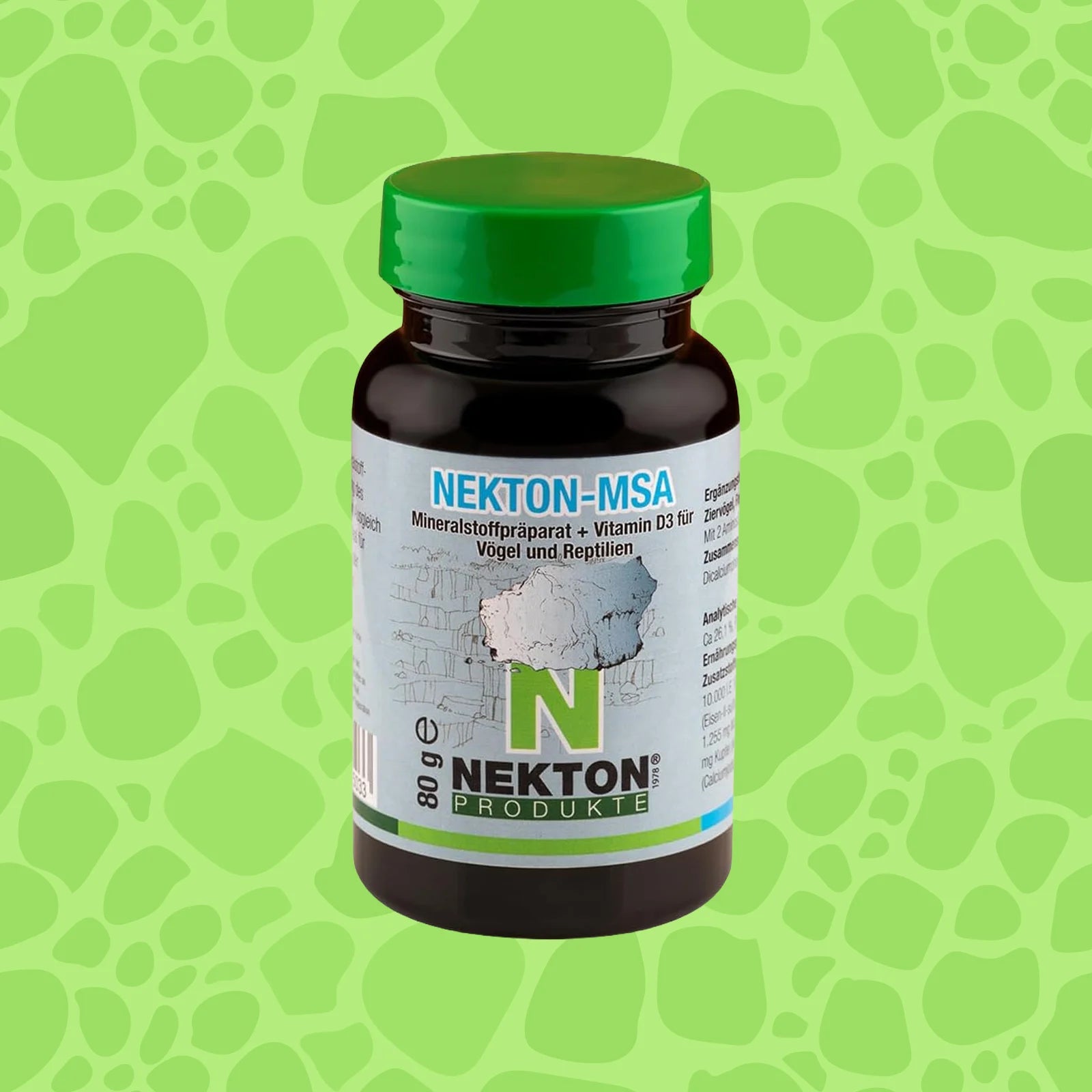 NEKTON-MSA ist eine mit Vitamin D3, Mengen-/Spurenelementen und Aminosäuren ergänzte, hochwertige Mineralstoffmischung. NEKTON-MSA unterstützt und versorgt Stoffwechsel und Knochen, verhindert Rachitis, aktiviert den Stoffumsatz und hilft Schäden durch Calciummangel auszugleichen. NEKTON-MSA deckt den erhöhten Bedarf an Mineralstoffen in der Zucht/Aufzucht, schützt vor Resorptionsstörung, steigert die Infektionsabwehr und verhindert Eibrüchigkeit beim Vogel. NEKTON-MSA unterstützt beim Jungtier einen guten Aufbau der knöchernen Strukturen. Gerade beim Jungtier ist dies besonders wichtig, um späteren Erkrankungen verursacht durch Mangelversorgung an Vitaminen und Mineralien vorzubeugen. NEKTON-MSA ist nicht wasserlöslich und problemlos unter das Weichfutter oder den Vogelgrit zu mischen.
